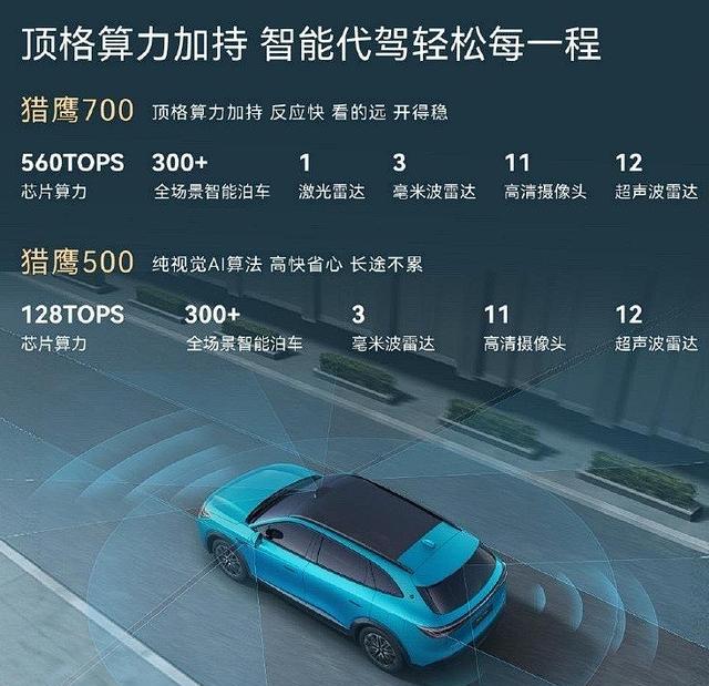 车内搭载灵犀智能座舱,内置3nm制程芯片,系统为风云UI 2.0,可实现全场景语音助手、全品牌手机互联以及无麦K歌。并提供23扬声器的“AI伯牙之音”、256色氛围灯、全景天幕+电动遮阳帘等配置。前排座椅标配加热与按摩功能,并可选装零重力座椅。智驾提供猎鹰200、猎鹰500以及可选的猎鹰700方案。其中猎鹰700包含车顶激光雷达和地平线征程6P芯片。